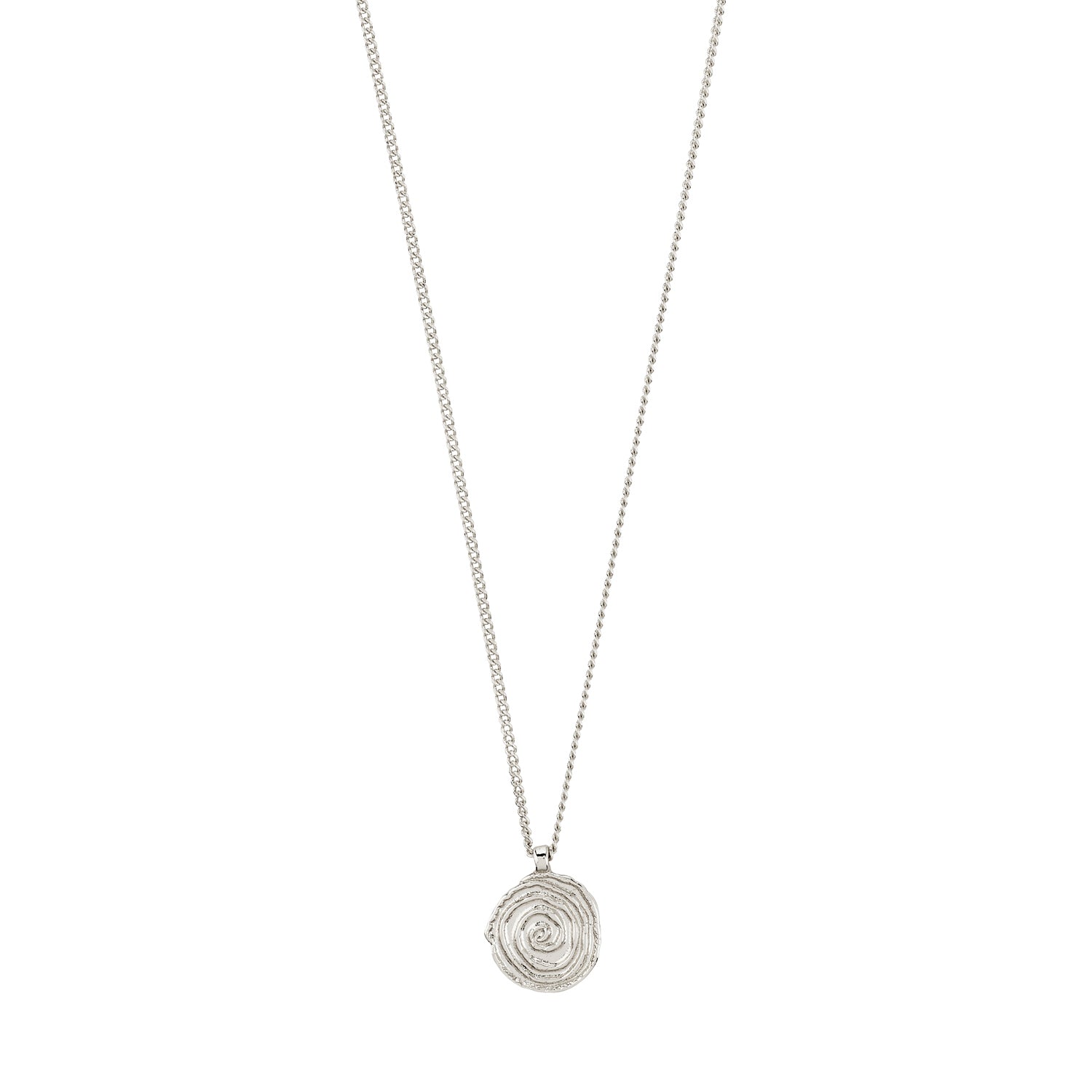 Waterproof Collection - Echoes of the North. The AIR necklace from Pilgrim is your new everyday icon — a silver-plated slim chain with a coin pendant that feels artisanal and airy. The spiral design blends ancient Scandinavian roots with a modern minimalist twist. Style it with wide-leg jeans and a cropped knit for a laid-back, boho aesthetic. Measures 40 cm + 12 cm extension and crafted from durable, water-resistant materials with 99% recycled content - because every detail matters.