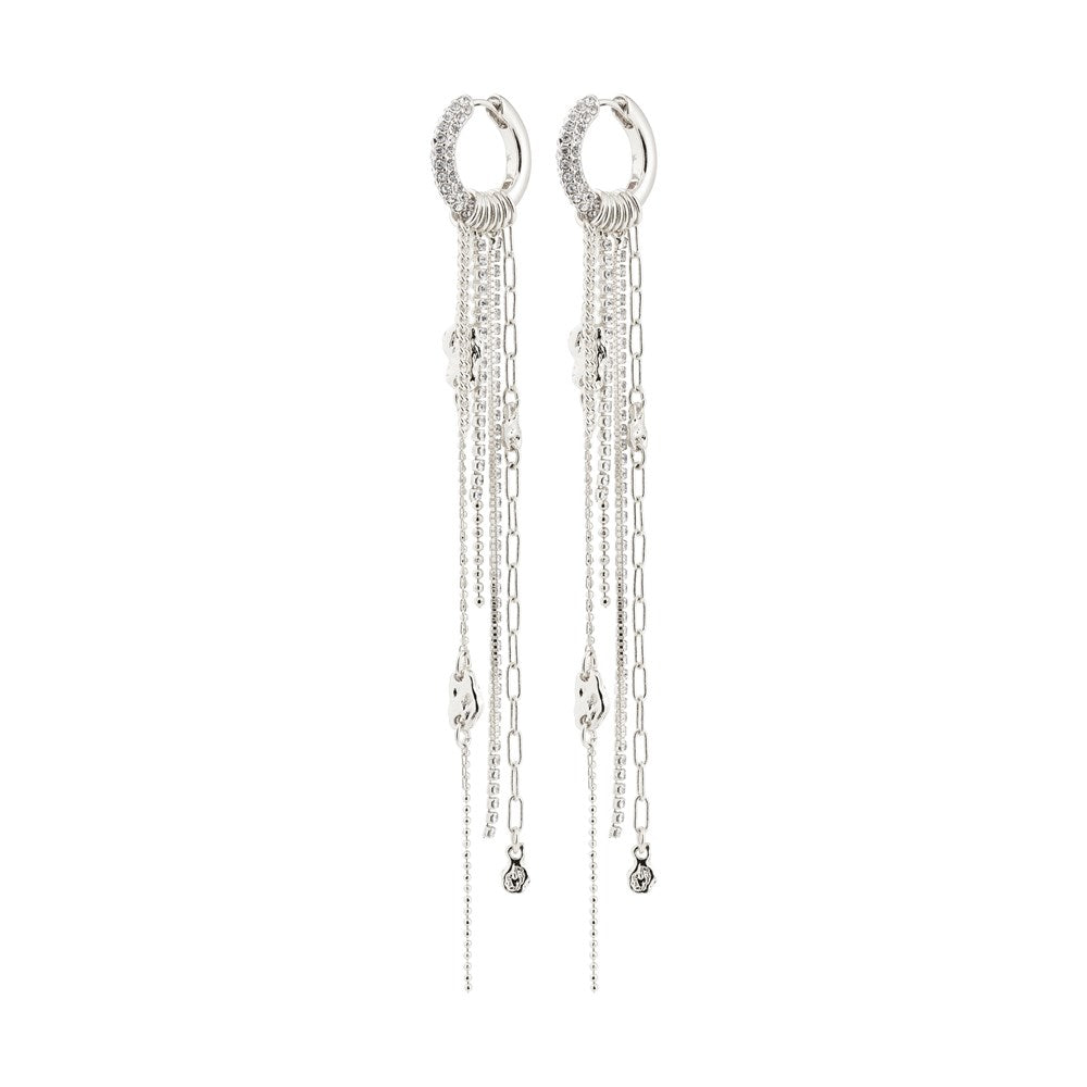Dripping in dreamy details! The silver-plated DRUE earrings from Pilgrim are the ultimate go-to when you want to add a hint of effortless luxury to your look. The small hoops with Preciosa crystals blend with a cascade of chains and fine pendants, creating a playful, free-minded expression with a breezy feel. Perfect for days when you want to embrace your inner boho goddess and let the details speak. Style them with a flowy maxi dress, bare shoulders, and a touch of sunkissed skin for a dreamy, luxe bohemian look. Made from 77% recycled material – fashion with care!