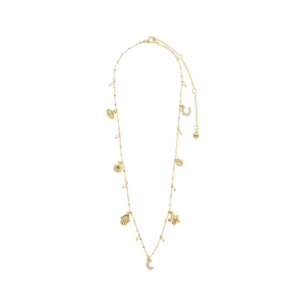 Make today special with the PRUCENCE necklace from Pilgrim - a treasure trove of charming symbolism. The gold-plated chain is sprinkled with small charms, each telling a story. From the warmth of the heart and the beauty of flowers and the mystery of the moon to the horseshoe symbolising happiness. The Hamsa, seashell and all-seeing eye add a fairytale dimension to your look, while tiny freshwater pearl and sparkling Preciosa crystals add a touch of elegance. Wear a universe of symbolism around your neck and feel connected to the wonders of the world. Designed with a comfortable length of 38 cm plus a 9 cm extension chain. Made from min. 75% recycled material, the PRUCENCE necklace is not just a piece of jewelry - it's a celebration of life.
