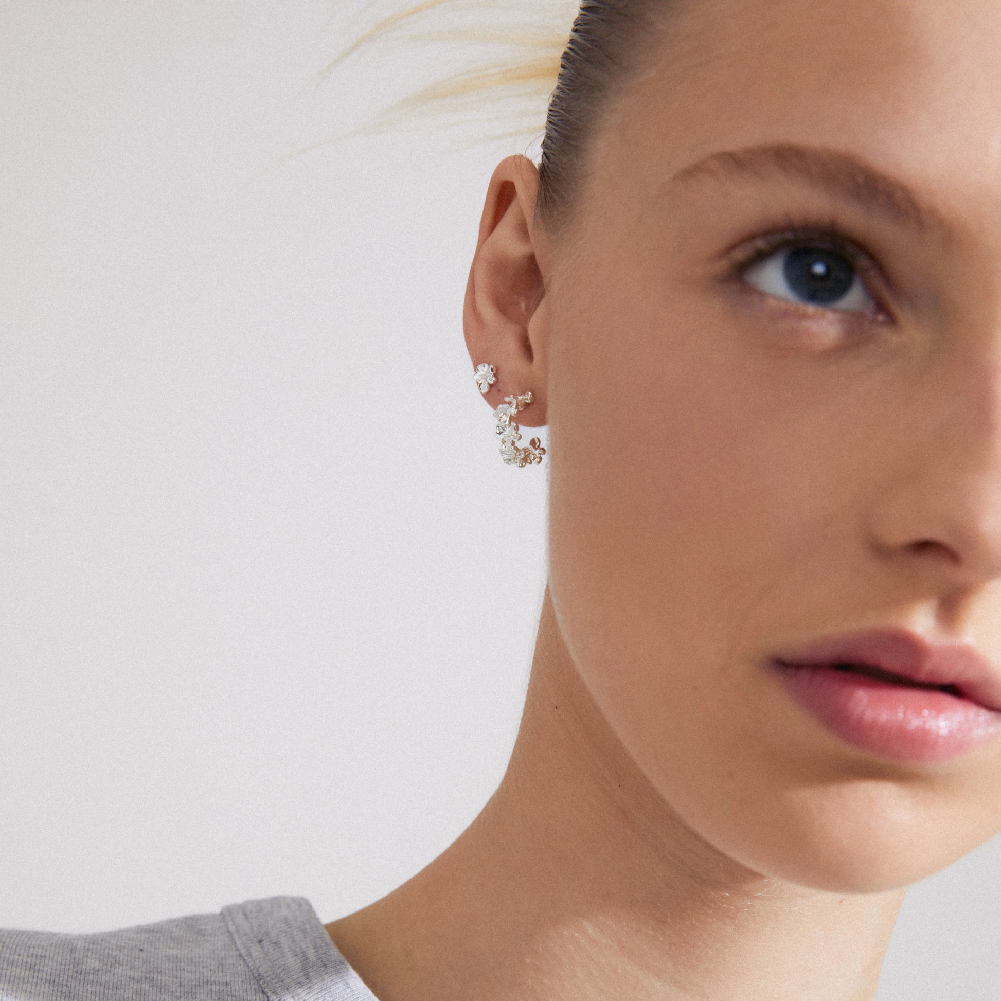 The final touch matters! Take on the world with the silver-plated, organic shaped ZHURI earrings from Pilgrim, where you get a 2-in-1 set. A set of half hoops with floral silhouettes and a set of casual tiny floral studs. Let the beautiful floral motifs be the finishing touch to your outfit and wear them together or separately depending on your styling. The ZHURI 2-in-1 kit is made from 97% recycled material.